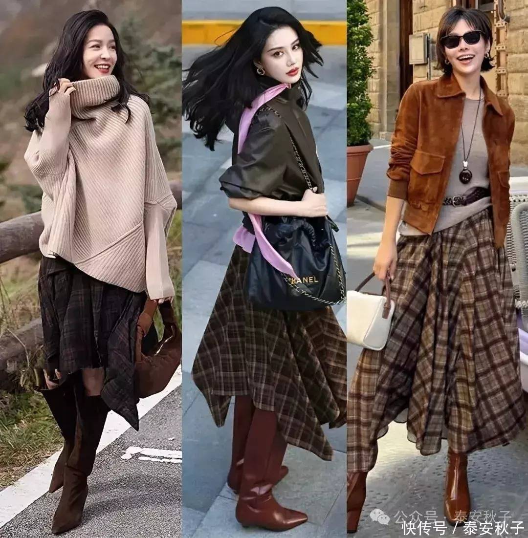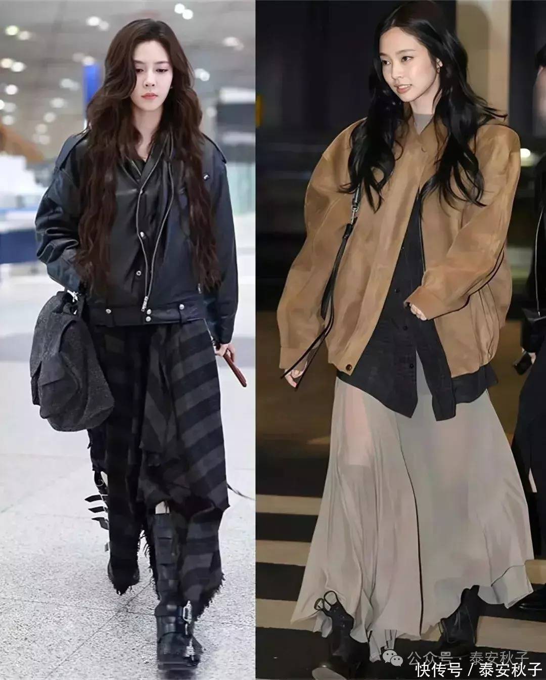 比如浅棕色皮草外套和黑色大摆裙的叠穿,显瘦和显高级的效果非常ok。