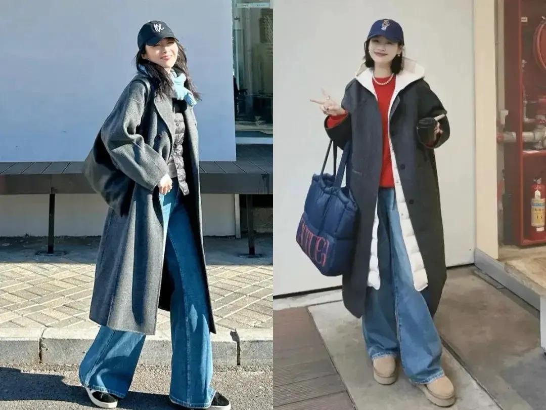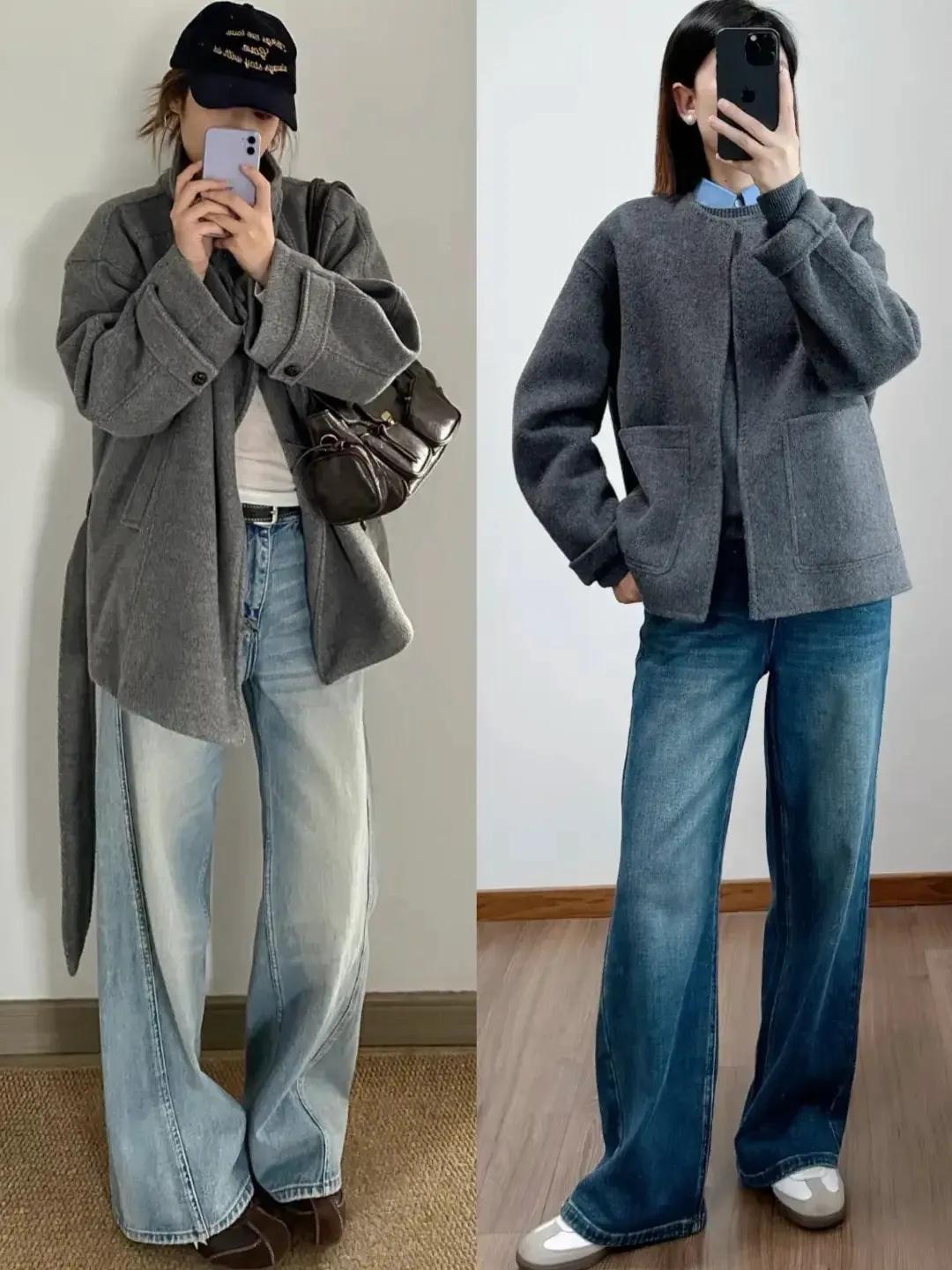 牛仔阔腿裤虽然很时髦,但你也要会选才行,要求面料柔软,挺括有型,穿上身有垂坠感,这样才能更好的遮肉显瘦,我们可以像上面这两位时尚达人一样,加上灰色的短外套,形成上短下长的搭配,这个时候身材就变成了三七分比例。