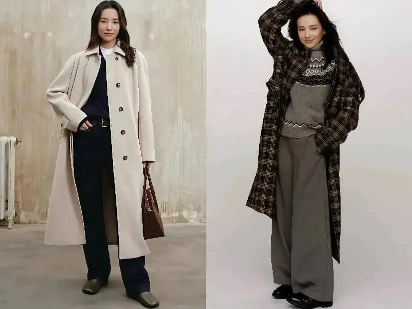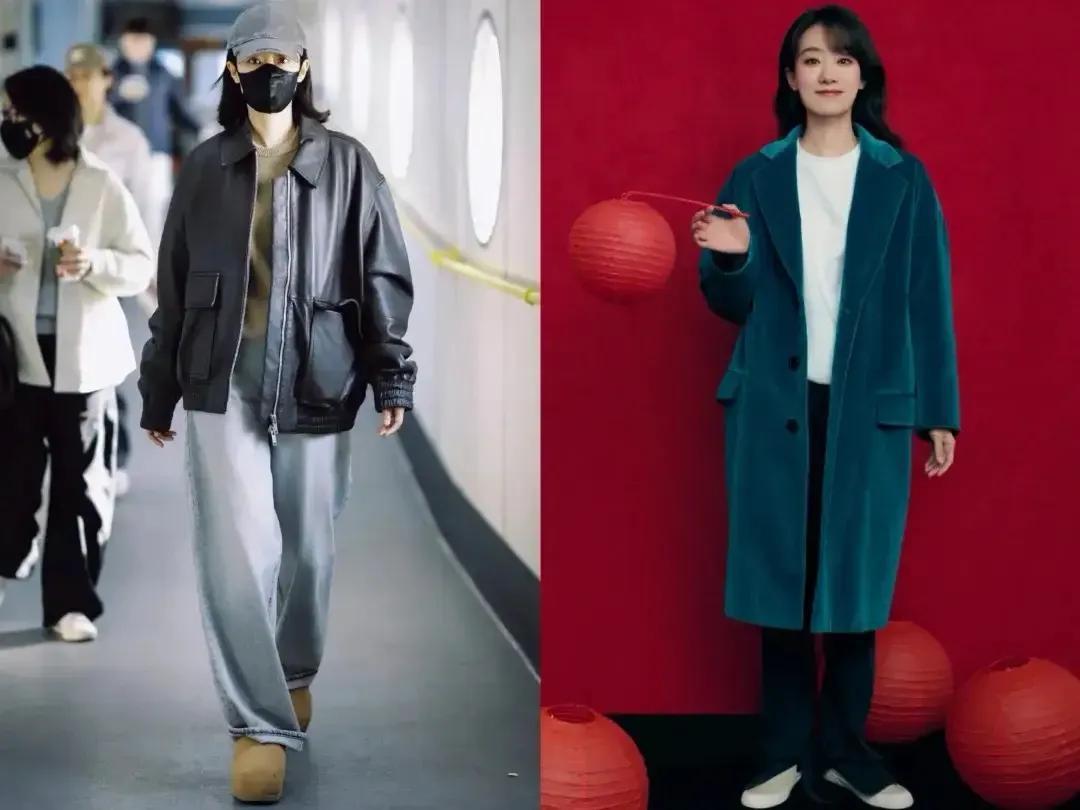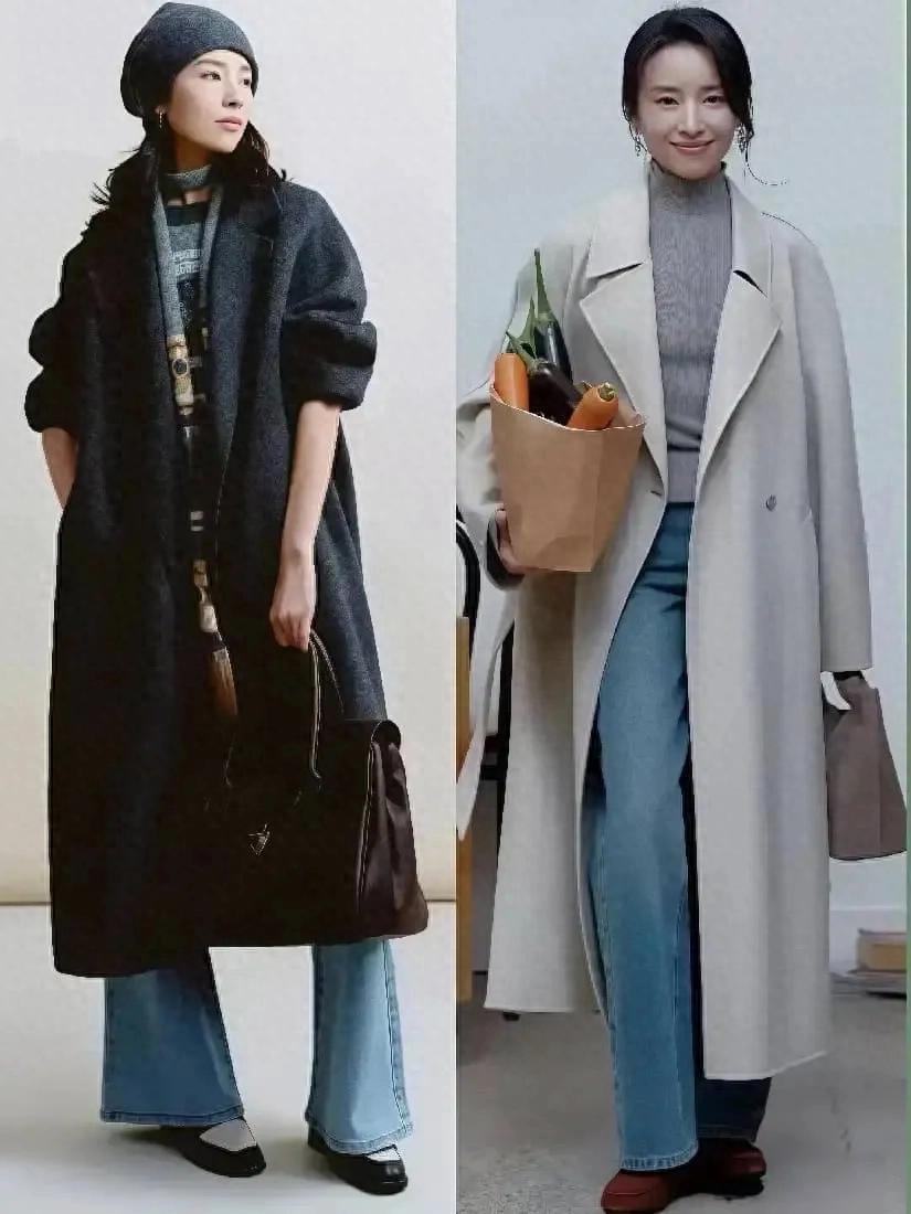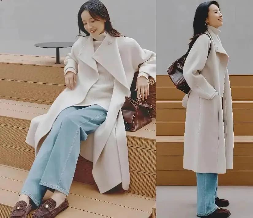 担心自己的穿搭出错,可以采用极简风的穿搭。就像上图董洁选择了一件灰白色的大衣,内搭灰色毛衣和一条蓝色的牛仔直筒阔腿裤,脚穿乐福鞋,这样的打扮简约大气,这种极简风的穿搭确实我们普通大众照着穿能够降低出错率。
