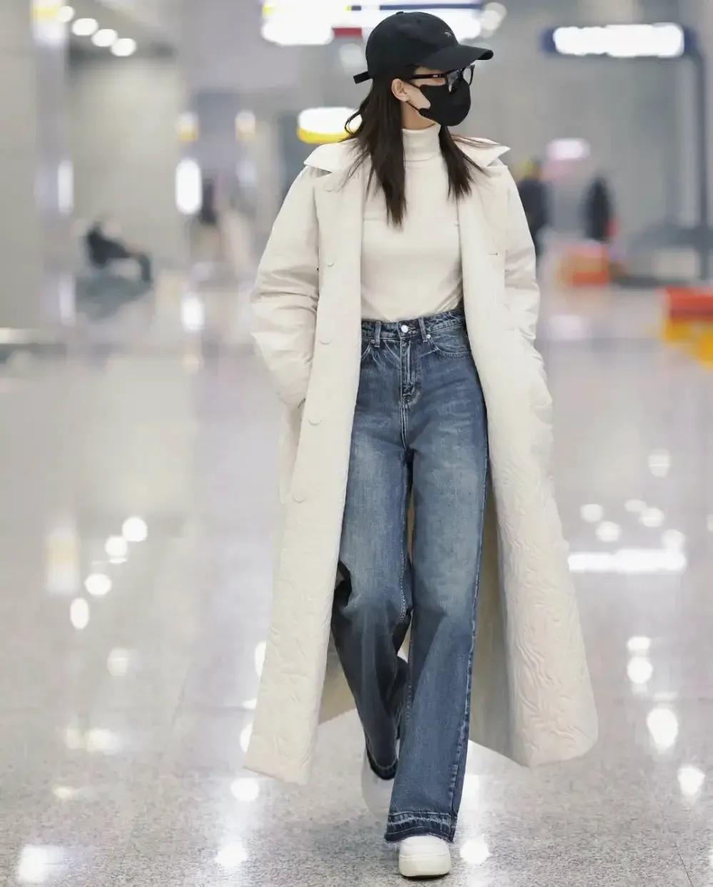 想让自己的身材变得比较流畅,推荐你选择 H 版型的长款白色羽绒服来搭配上牛仔直筒裤,内搭一件白色的针织毛衣,穿的时候把衣角塞进裤子里面,就能形成“高腰线”,这样身材就能形成三七分比例,自然显高显瘦,整体的视觉效果身材非常流畅。