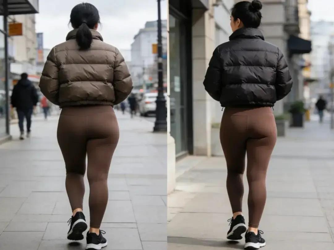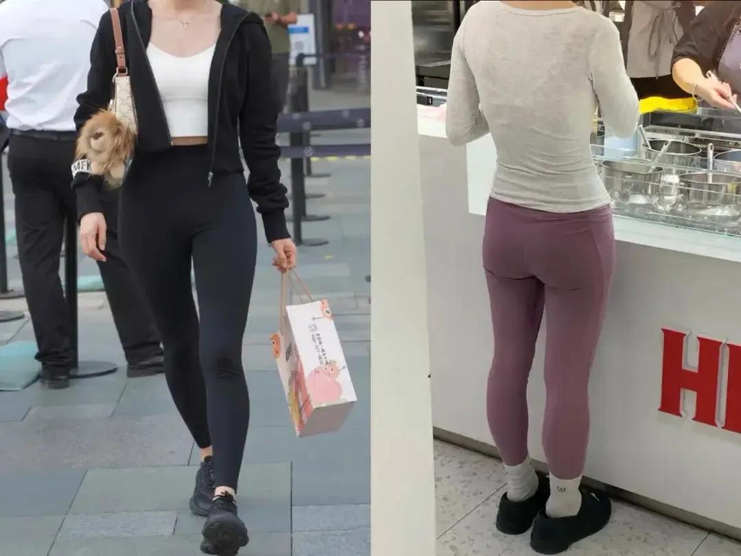 想要把无痕裤穿出时尚感,胯骨不能宽,大腿不能粗,甚至是臀型不能扁塌,如果你的臀形扁塌,当你像上图右边这位素人穿的紫色的无痕裤,完全暴露了她臀型扁塌的问题,还含胸驼背,根本无法撑起无痕裤。