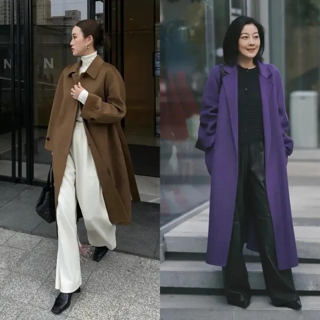 像白色的阔腿裤,会让你的造型配色更有活力感。直接学习上图右边这位时尚达人,用白色阔腿裤搭配上白色毛衣,加一件驼色的大衣外套,脚穿黑色粗跟短靴,这样的造型通勤时髦,简约干练。